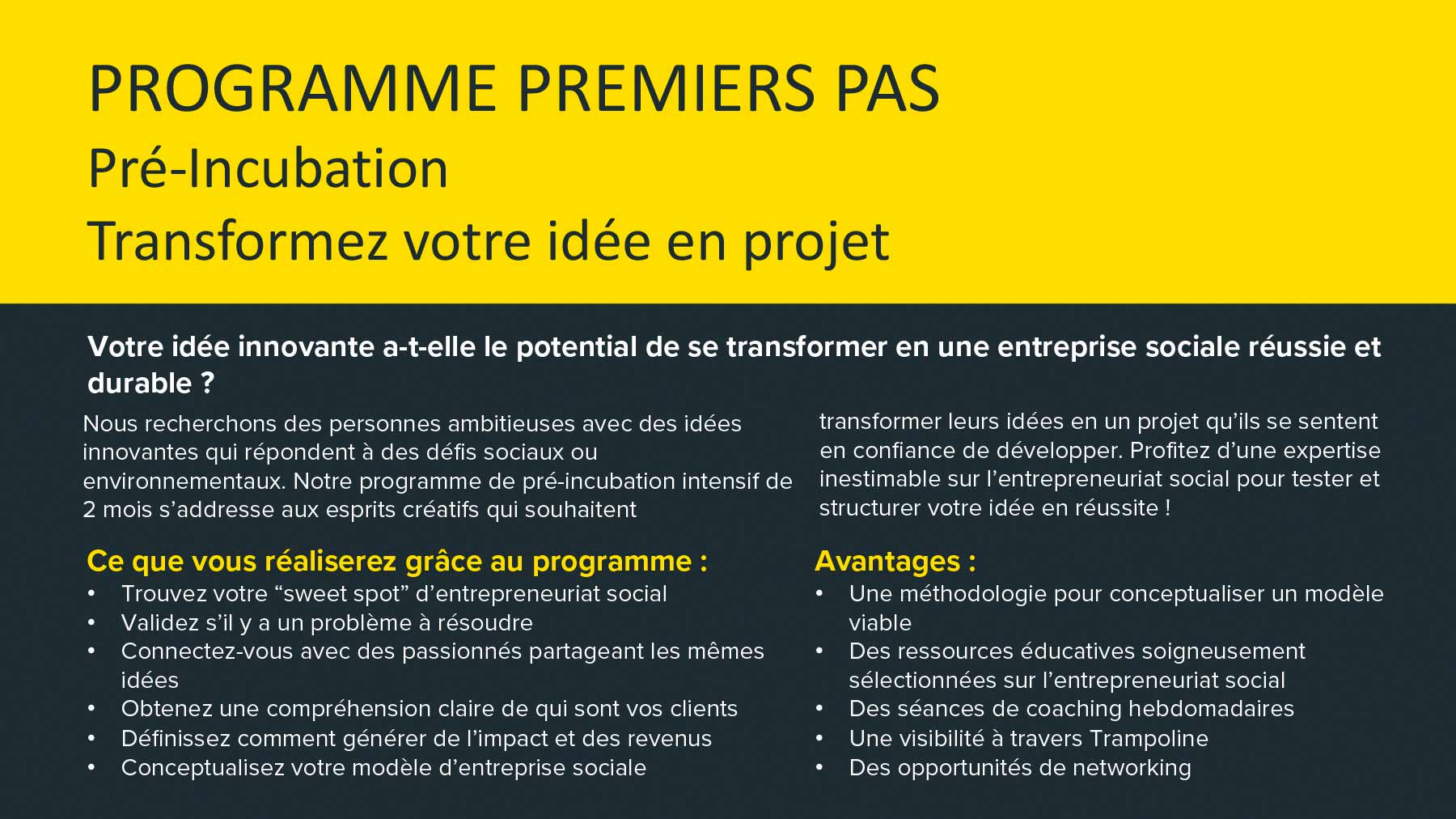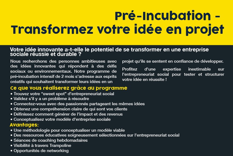 En tant que plateforme d’accélération, l’objectif principal de Trampoline est d’encourager et d’optimiser les entreprises sociales en leur proposant un programme d’accompagnement sur mesure gratuit, de coaching, de formation, de networking pour concrétiser leurs projets d’entrepreneuriat social.