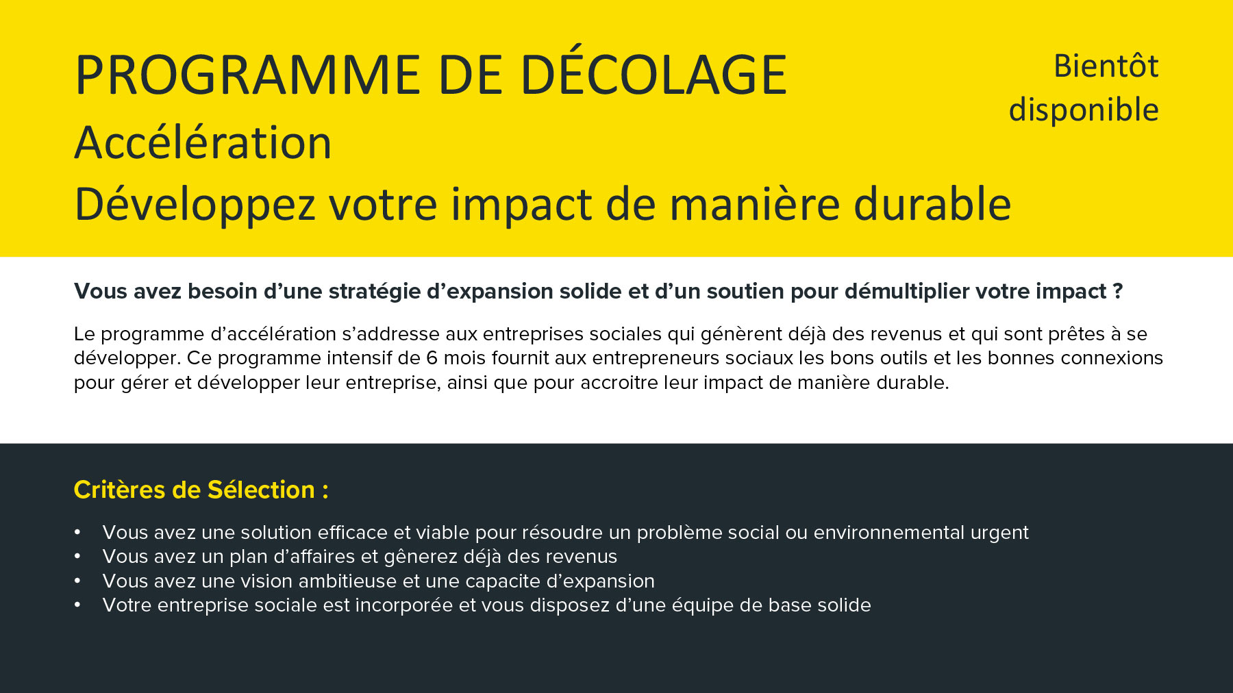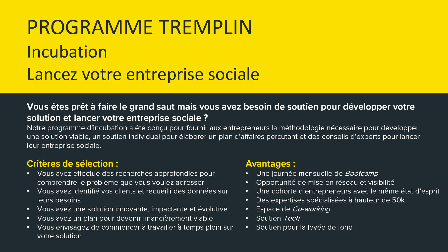 d’accompagnement structurés, ainsi qu’un mentorat dédié, nous accompagnons les entrepreneurs sociaux à chaque étape de leur parcours, de la pré-incubation à l’accélération de leurs projets.